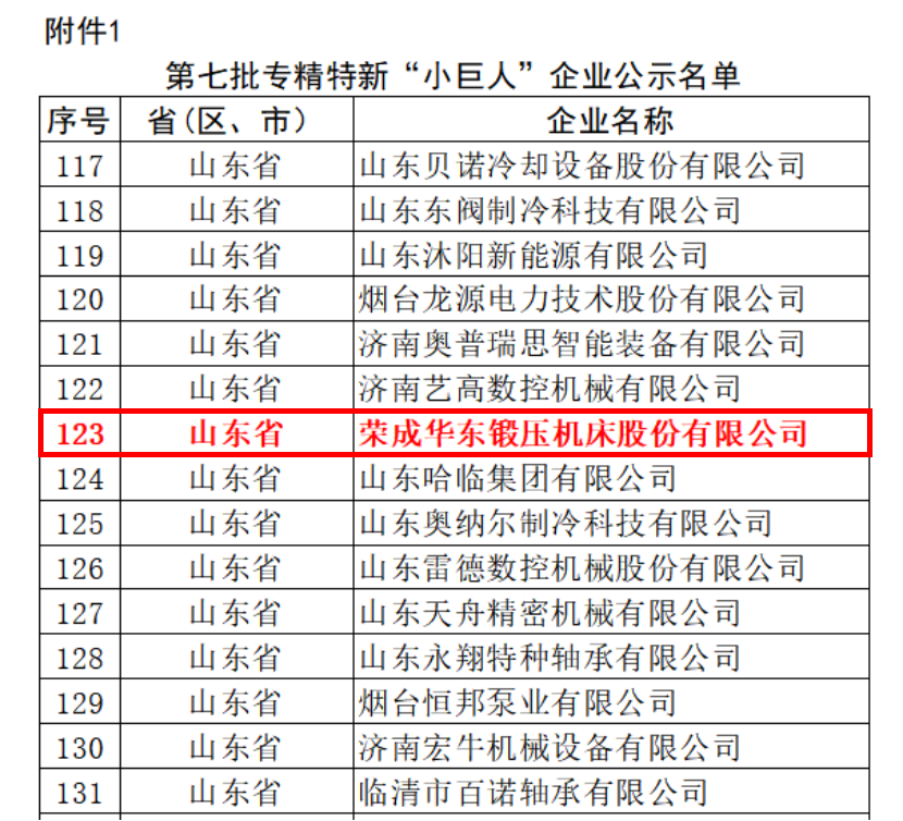 近日,山東省工業和信息化廳公布《關於山東省第七(qī)批(pī)專精特新”小巨人”企業名單公示》,榮成華東鍛壓機床股份有限公司憑借其在金(jīn)屬成形機床高端裝備領域突出的創新能力、技術實力(lì)和市(shì)場地位,成(chéng)功(gōng)入選。這一國家級榮譽的獲得,標誌著(zhe)榮成華東鍛壓機床股份有限(xiàn)公司在專業化、精細化、特色化、新穎化的發展道路上取得裏程碑式的成就(jiù)。